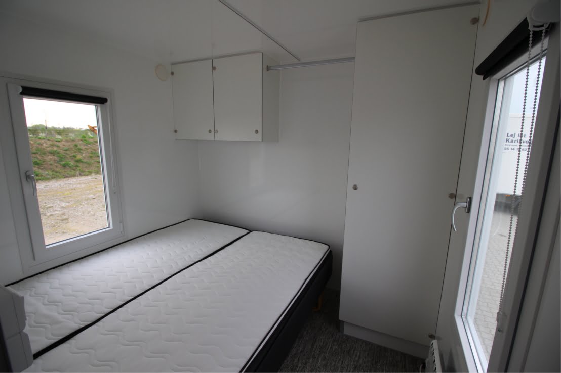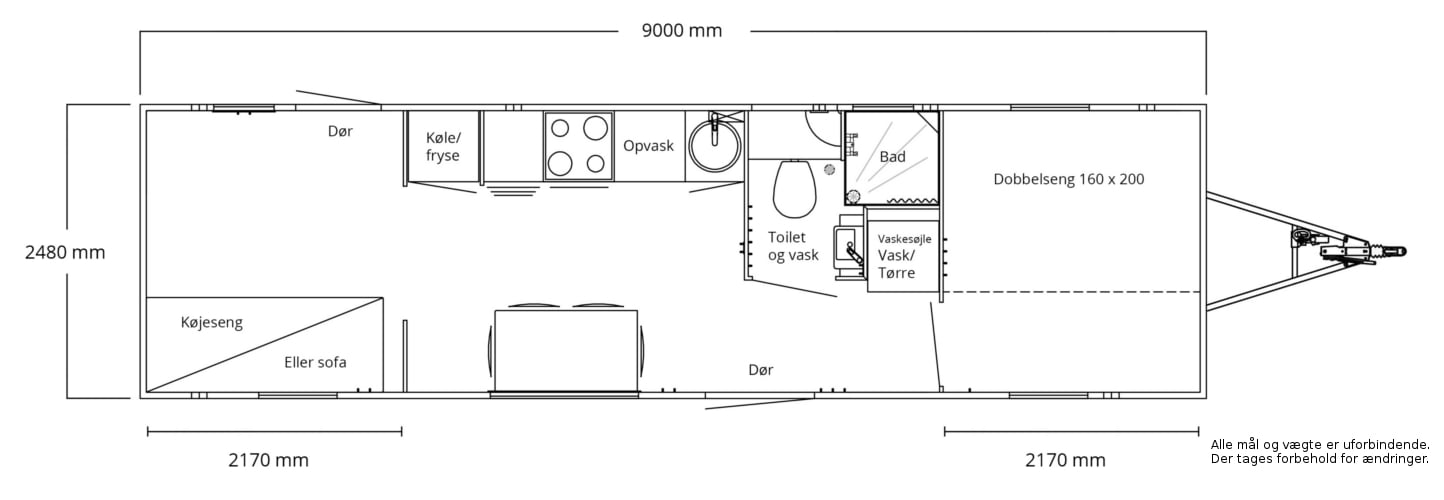 Vognen er med 1 bred indgangsdør (90 cm), og 1 terrassedør på modsatte side af vognen. En vogn med høj komfort, f.eks. opvaskemaskine, fryseskab, ovn og vaskemaskine samt tørretumbler.