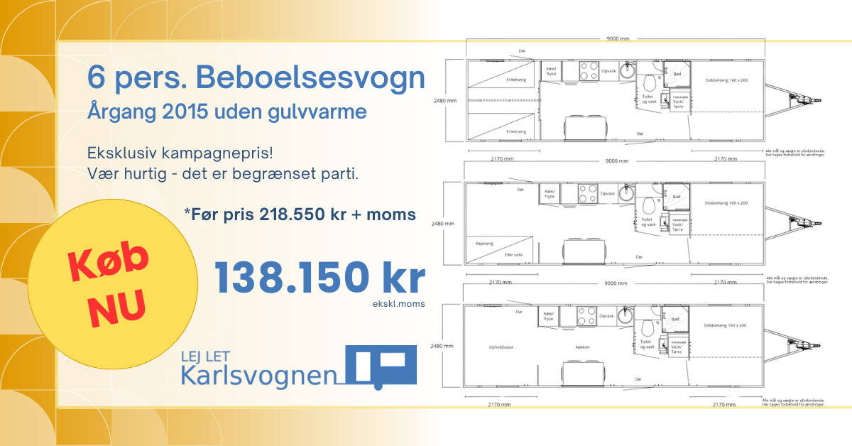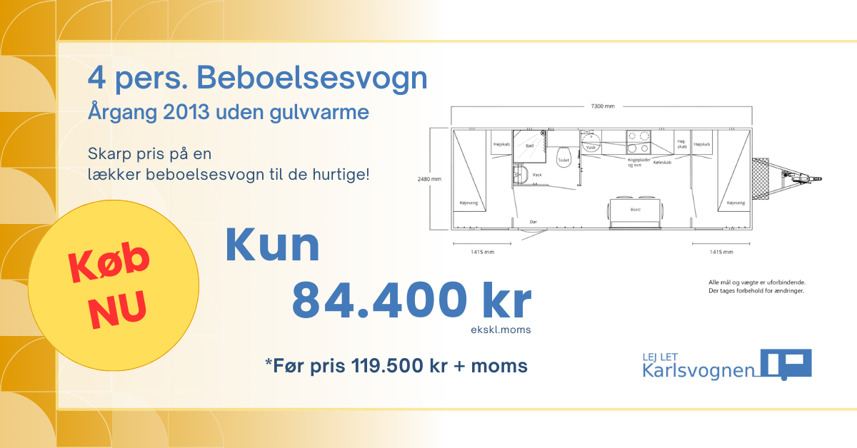 OBS! Alle vogne leveres nysynet og omregistret inklusiv elkabel, vand- og kloakslanger – lige klar til brug.
